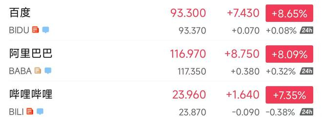 百度阿里B站大涨超7%