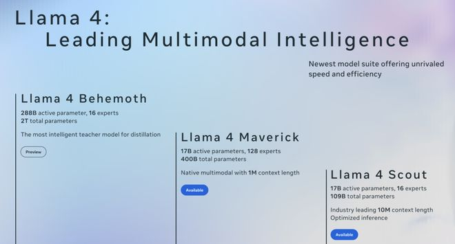 Llama4系列中的旗舰大模型Behemoth,是参数总量达2万亿的稀疏专家模型(MoE),架构为A288B 16E——即具备2880亿激活参数、共计16个专家模块,但尚未公开发布