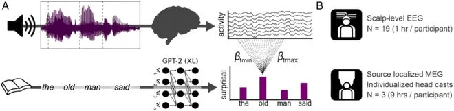 实验和分析框架的示意图。(a)(顶部)在两个实验中,参与者在记录大脑活动时都聆听了有声读物的连续录音。(底部)参与者听取的文本由深度神经网络(GPT-2)分析,以量化每个单词的上下文概率。使用基于回归的技术来估计(不同级别)语言意外性对连续记录中诱发响应的影响。(b)分析的数据集:一个组级的脑电图数据集和一个单独的主题源源定位的MEG数据集。图源:[4]