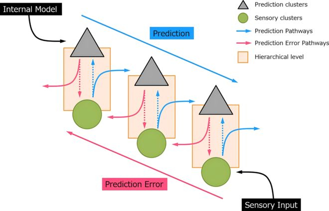 简化的感觉预测模型。蓝色箭头指示如何更新预测神经元,并传递到较低的层次结构级别。红色箭头指示如何生成预测误差并将其进给到更高的层次结构级别。图源:doi:10.3389/fpsyt.2020.557932.
