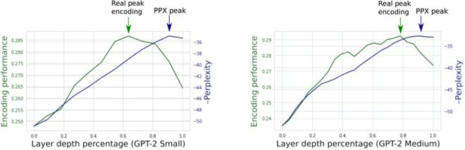 GPT-2小型、中型编码模型随层深变化的编码表现。图源:[3]