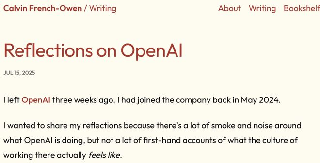 如今,Calvin French-Owen想趁热打铁,效仿Nabeel Quereshi的《对Palantir的反思》,揭秘OpenAI的独特之处。