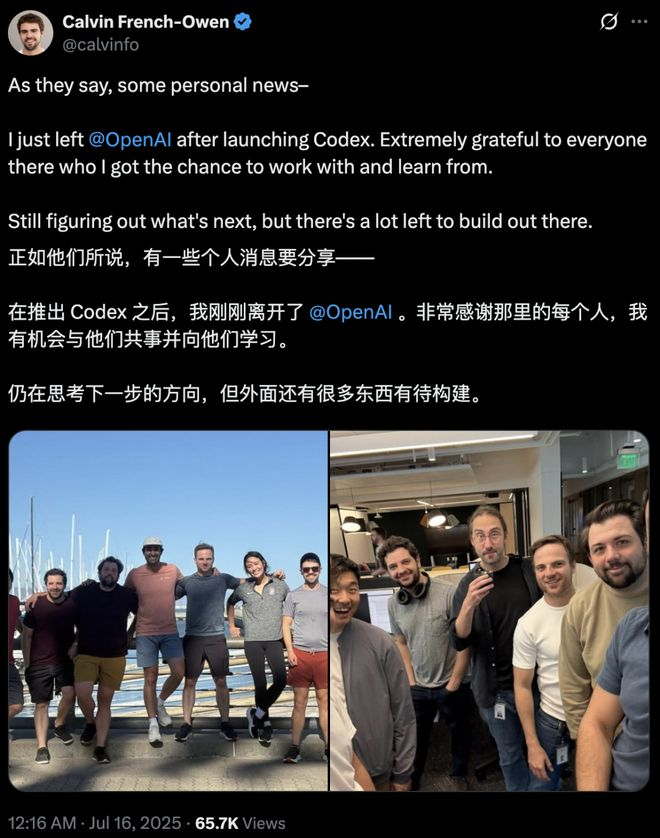 三周前,在推出Codex后,Calvin French-Owen离开了OpenAI。
