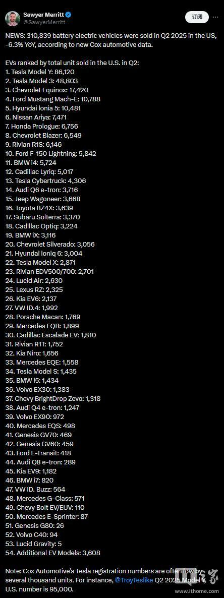 IT之家 7 月 16 日消息,2025 年第二季度,尽管美国电动汽车市场整体销量同比下降 6.3%,但特斯拉的 Model Y 和 Model 3 依然稳居销量榜首。据 Cox Automotive 数据显示,Model Y 在该季度售出 86,120 辆,Model 3 售出 48,803 辆,两款车型合计占美国第二季度电动汽车总销量的 43%。