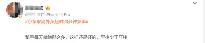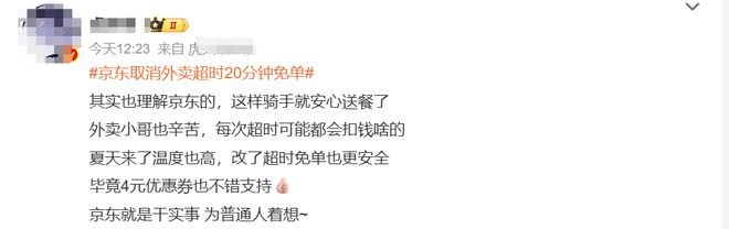 不同于以往平台取消或减少活动、福利后用户“一边倒”的讨伐之声,此次京东取消“超时20分钟免单”反而获得了部分网友的谅解,认为这样骑手可以安心送餐,“夏天来了温度高,改了超时免单也更安全”。
