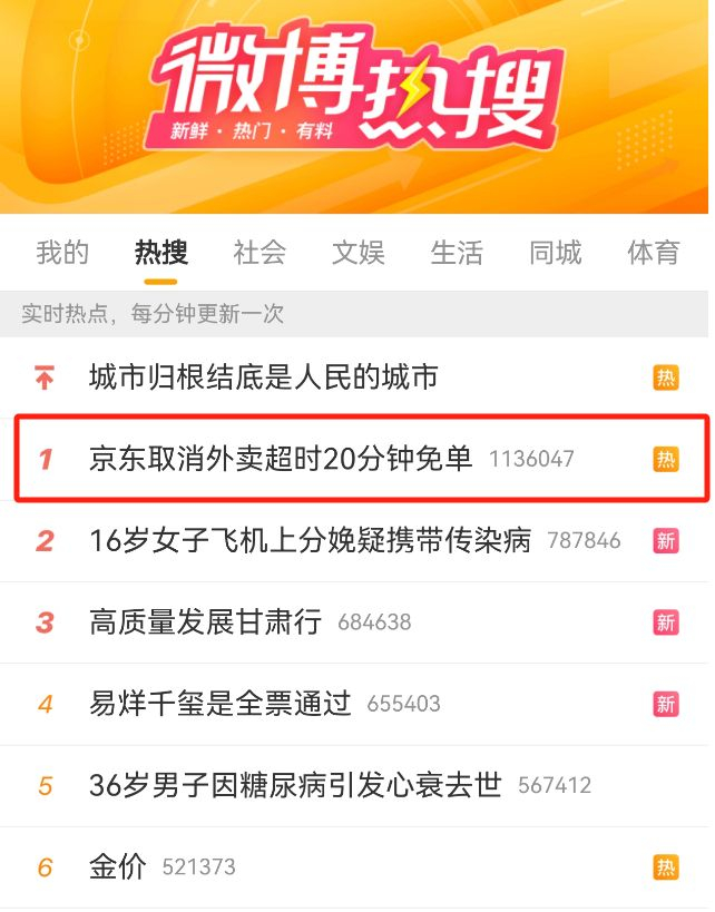 7月16日,#京东取消外卖超时20分钟免单#的词条登上微博热搜榜,迅速冲上热搜首位。