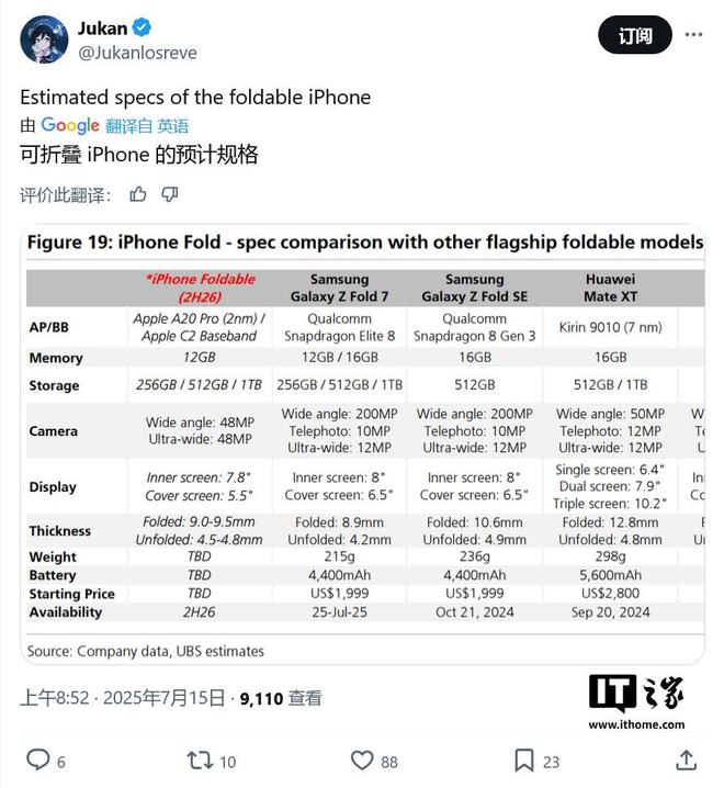IT之家 7 月 16 日消息,消息源 @Jukanlosreve 昨日(7 月 15 日)在 X 平台发布推文,分享了瑞银(UBS)报告的更多细节,称苹果首款折叠 iPhone 将采用 A20 Pro 芯片,内存为 12GB。