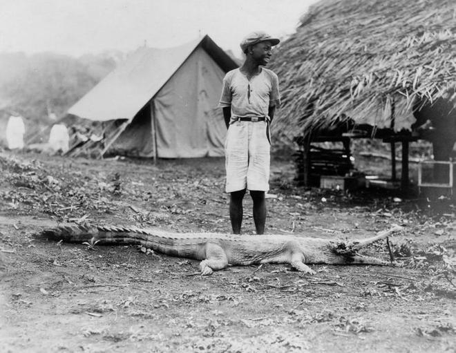 一名受考察队雇用的利比里亚年轻工人与一条被猎杀的鳄鱼。在为哈佛大学比较动物学博物馆收集野生动物的过程中,斯特朗及其团队依赖当地原住民猎人的技艺。洛林·惠特曼摄于1926年(印第安纳大学图书馆收藏)