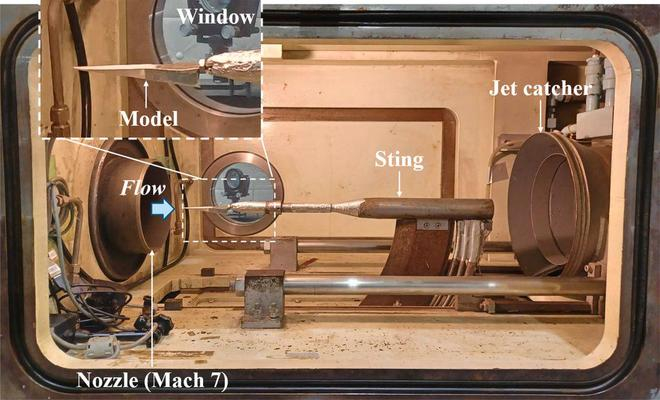 为了验证模拟结果,研究团队在马赫 7 的超音速风洞中,测试缩小比例(1:3)的模型,模型有一个纸质的鼻子和铝制的尾巴,测试中温度达到了 650 开尔文(376.8 摄氏度)。