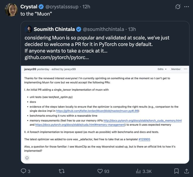 工程师们的日常分享也充满了幽默感和人情味。有人会玩技术谐音梗,在一条讨论PyTorch新优化器Muon的推文下,俏皮地回复“to the ‘Muon’”。