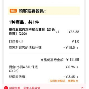 以7月13日一笔35.88元的外卖订单为例,扣除18元的商家补贴,0.96元的平台佣金,以及3.45元的配送服务费后,阿文实际收入仅14.47元,实收率40%。