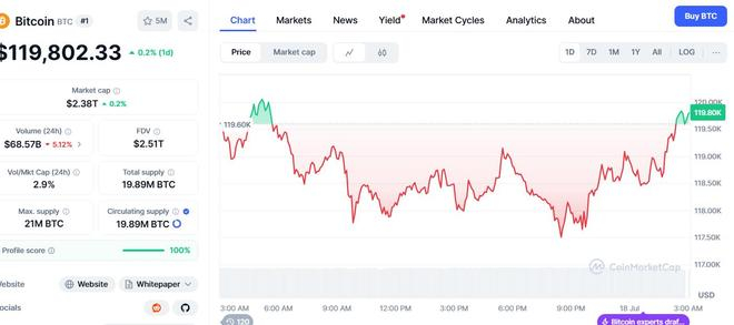 周四美股午盘时段,莱维特讲话期间,比特币盘中曾小幅转涨。CoinMarketCap数据显示,比特币曾涨破11.98万美元逼近12万大关,较欧股盘中跌破11.76万美元的日内低位涨超2000美元、涨近2%。
