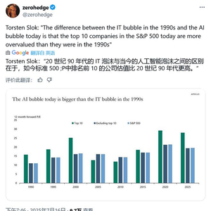 IT之家注:Torsten Sløk 是美国资产管理公司 Apollo Global Management 的首席经济学家,他认为相比较“互联网泡沫”,目前 AI 公司被高估情况更为严重。