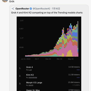 马斯克在推特上转发了的OpenRouter趋势数据显示,K2的在一周内攀升至全球趋势榜第二,仅次于Grok 4。