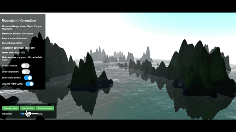 △Prompt: Create a 3D HTML mountain scene with cliffs, rivers, and day-night lighting. Supports drag/zoom, animated transitions, realistic gradients, and toggleable contour lines... (创建一个 3D HTML 山脉场景,包含悬崖、河流和昼夜光照变化。支持拖动和缩放、动画过渡、真实感渐变色,并可切换等高线显示...) 来源:Kimi