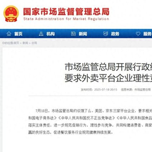 7月18日,市场监管总局约谈饿了么、美团京东三家平台企业,要求相关平台企业严格遵守《中华人民共和国电子商务法》《中华人民共和国反不正当竞争法》《中华人民共和国食品安全法》等法律法规规定,严格落实主体责任,进一步规范促销行为,理性参与竞争,共同构建消费者、商家、外卖骑手和平台企业等多方共赢的良好生态,促进餐饮服务行业规范健康持续发展。