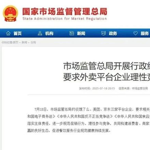 7月18日,市场监管总局约谈饿了么、美团、京东三家平台企业,要求相关平台企业严格遵守《中华人民共和国电子商务法》《中华人民共和国反不正当竞争法》《中华人民共和国食品安全法》等法律法规规定,严格落实主体责任,进一步规范促销行为,理性参与竞争,共同构建消费者、商家、外卖骑手和平台企业等多方共赢的良好生态,促进餐饮服务行业规范健康持续发展。