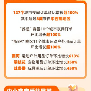 暑期各中心城市及旅游城市消费增长明显,尤其是夜间经济蓬勃发展,在淘宝闪购的订单里,国人的夏日夜生活愈发丰富。报告显示,7月以来,127个城市的夜间订单环比6月增长超100%,其中超过8成为中西部地区。其中,漯河、包头、朔州、许昌、商丘成为夜间订单增长最快的5个城市,增速均超200%。