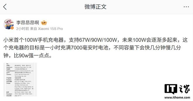同时博主 @李昂昂昂啊 今日也发布微博称,这款充电器能兼容 67W / 90W / 100W 充电,目标是一小时充满 7000 毫安时的电池。未来配备 100W 充电器的手机会逐渐多起来,这款充电器“比 90W 强一点点”。