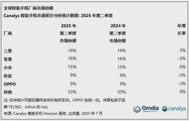 据Canalys最新公布的数据显示,2025年第二季度,三星成功守住了全球市场领先地位,占据了19%的市场份额。苹果位列第二,占比16%。小米表现稳定,占据15%的市场份额。传音与OPPO分别以9%的市场份额跻身前五。