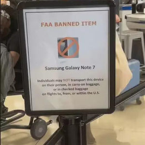 一位网友于六月下旬拍摄了美国机场的一则警示信息,上面鲜明地写道:“美国联邦航空管理局(FAA)禁止携带物品——三星 Galaxy Note 7。个人不得携带此设备登机、放入随身行李或托运行李中,适用于前往、离开或在美国境内飞行的所有航班。”