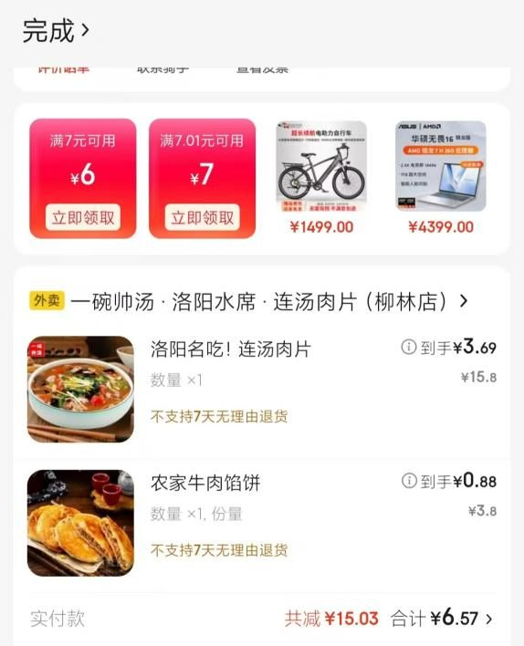 老郭刚刚下单一份连汤肉片和一个牛肉馅饼,合起来才支付了6.57元,比原价省了15。上一顿的青菜瘦肉粥和猪肉蒸饺共花了8.99,省了10块。他比较满意,又担心最近都这样吃,习惯的“神券”停了之后该怎么办。