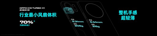 为了解决内置风扇模组带来的机身厚度问题,K13 Turbo 系列延续OPPO在精工设计方面的技术优势,将疾风散热引擎模组高度集成,对比传统方案体积缩小70%,释放更多空间供其他模块堆叠,堪称模组设计新标杆。同时,疾风散热引擎还首创潜水泵设计、超精密焊接工艺等方式,在集成散热风扇的手机中,打造出行业唯一的IPX9 & IPX8 & IPX6 满级防水体验。