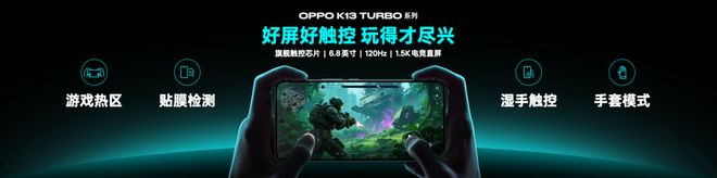 无论游戏场景还是户外高温场景体验,在 K13 Turbo 系列的1.5K/120Hz高刷电竞屏上都得以清晰呈现。配合10bit屏幕色深,以及高达 1600 尼特的全局峰值亮度,K13 Turbo系列以超高屏幕素质征服双眼视感。同时,K13 Turbo系列搭载旗舰电竞级触控芯片,不仅带来电竞级触控体验,更支持湿手触控和手套模式,任何环境都有流畅操作体验。此外,OPPO 自研的护眼技术方案,让K13 Turbo系列的屏幕在暗光下也能拥有柔和舒适的观感。