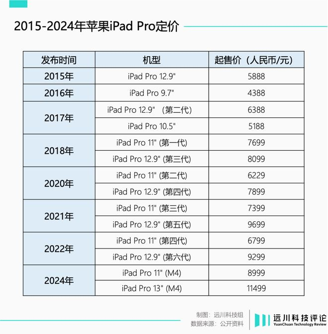 与之相对的是不断上涨的价格:苹果最新一代13英寸iPad Pro,起售价已经从799美元上升到了1299美元(11499元)。