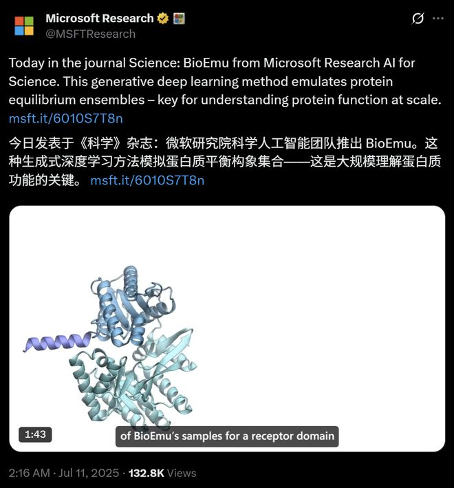 网友评论,「微软研究院的突破令人振奋!在如此规模上对蛋白质平衡集合建模,对药物发现和疾病理解具有重大意义。BioEmu将数年的结构模拟浓缩到数小时内,是一个巨大的飞跃。」