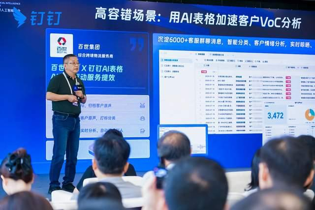 百世集团成立于2007年,是全球领先的智慧供应链解决方案与物流服务提供商。百世集团高级副总裁张砚冰表示,百世集团将企业场景分为“高容错场景”和“低容错场景”,在高容错场景中,AI的表现充满惊喜。他以客户之声场景为例,百世集团通过使用钉钉AI表格对6000+客服群聊消息进行管理,通过AI实现了智能分类、客户情绪分析,同时还能实时晾晒,自动推送给相关人员,驱动完成自身服务的改善与提效。