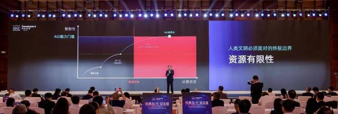 夏立雪指出,从传统算法,到 AI1.0、AI2.0 阶段,在 Scaling Law 的推动下,计算资源持续驱动着智能边界的拓展,逼近 AGI 的临界点。然而,有一条人类文明的终极边界始终横亘在 AGI 之路上 —— 资源的有限性。