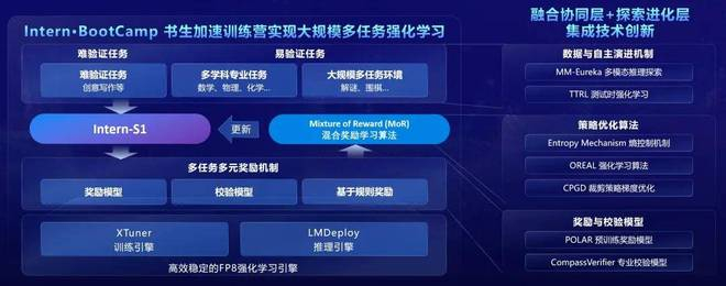 在算法层面,基于Intern·BootCamp构建的大规模多任务交互环境,研究团队提出Mixture of Rewards混合奖励学习算法,融合多种奖励和反馈信号,在易验证的任务上采用RLVR训练范式,通过规则、验证器或者交互环境提供奖励信号;在难验证的任务上(如,对话和写作任务)采用奖励模型提供的奖励信号进行联合训练。同时,训练算法还集成了上海AI实验室在大模型强化学习训练策略上的多项研究成果,实现了训练效率和稳定性的显著提升。