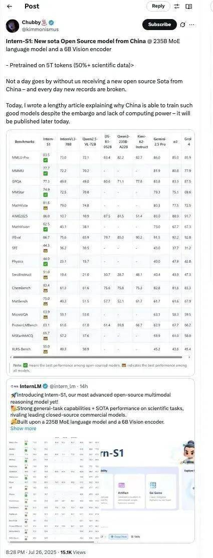 Intern-S1在国际开源社区引发了关注,不少知名博主纷纷为其点赞,并称“几乎每天都能看到来自中国的新开源Sota成果——纪录每天都在被刷新。”