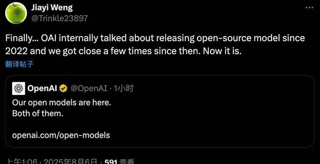 据在 OpenAI 任职研究科学家的清华校友翁家翌透露,从 2022 年 OpenAI 内部就讨论模型开源,并曾数次接近「开源」目的,但直到今天才实现。
