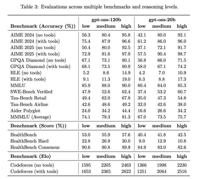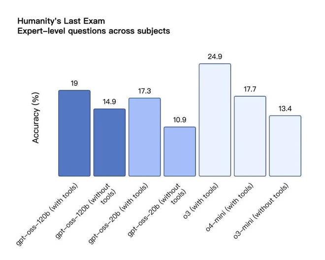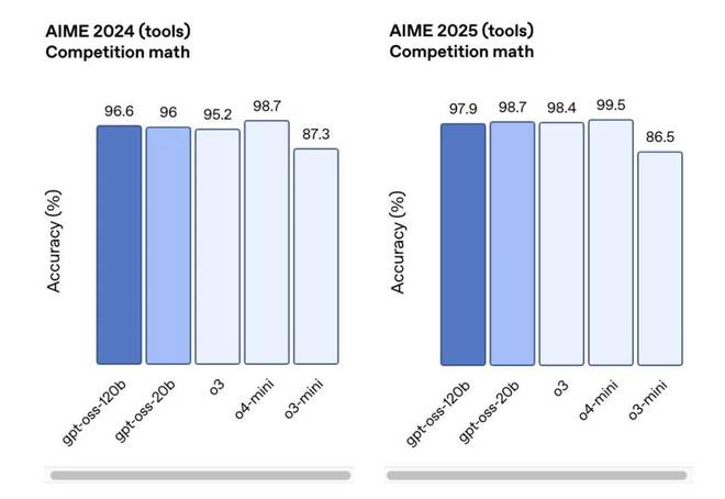 在医疗查询(HealthBench)和竞赛数学(AIME 2024&2025)领域表现更优于 O4-mini。尽管体积小巧,GPT-OSS-20B 在这些测试中仍与 o3-mini 持平甚至超越,尤其在竞赛数学和医疗领域表现更为突出。