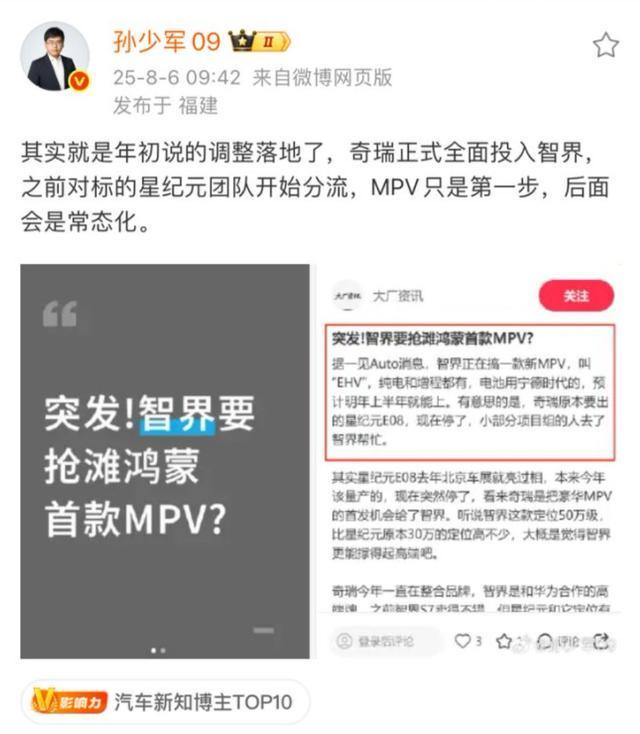 这其中,智界MPV是智界汽车“产销服”发生根本性变化的另一大佐证。据了解,智界MPV计划于2026年第一季度正式发布。“其实就是年初说的调整落地了,奇瑞正式全面投入智界,之前对标的星纪元团队开始分流,MPV只是第一步,后面会是常态化。”孙少军透露。