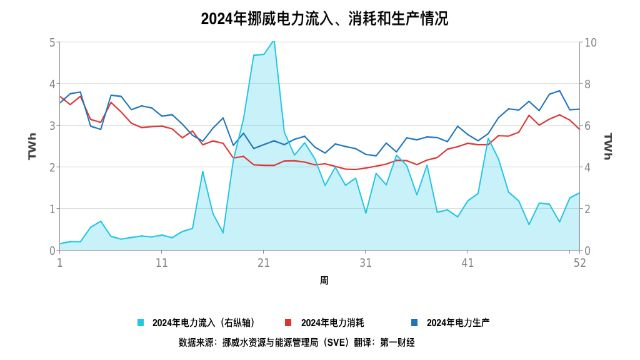 根据挪威水资源与能源管理局(NVE)的数据,2022年,挪威的电力过剩量为12.5太瓦时(TWh)。在2024年中,除年初少数几周,绝大多数时间中挪威电力供大于求。
