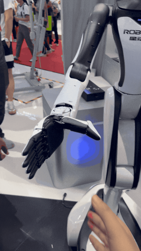 擎朗智能家的XMAN-R1搭载11项多模态传感器,并结合了自研的三维重建技术。虽然主职是服务员(比如餐厅),但它在本届机器人大会上也给大家卖了个萌。