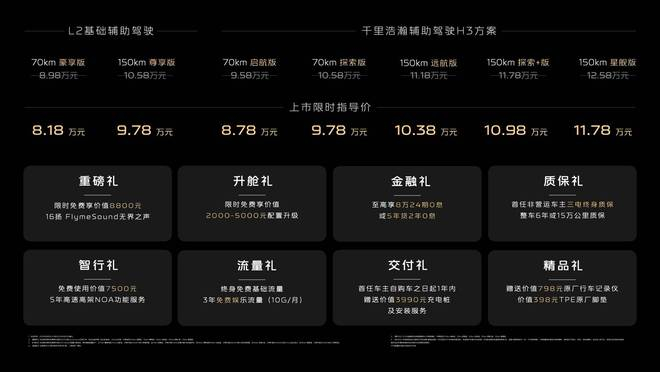 吉利银河 A7 提供了 7 个配置价格,其中两个版本配备 L2 级基础辅助驾驶,另外五个版本均配备了吉利自研的「千里浩瀚辅助驾驶 H3 方案」。