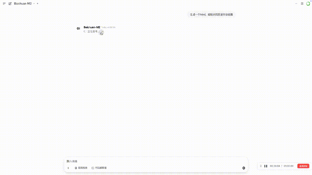 接下来,让它生成一个绘制太阳系运行动态HTML。在推理过程中,它缜密地列出了设计思路和子任务,随后疯狂输出代码。