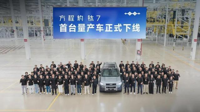 方程豹钛7首台量产车也迎来下线,预计会在今年四季度上市。这款中大型SUV采用承载式车身结构,造型延续豹5、豹8的硬派和霸气,拥有粗壮的保险杠、方正的前大灯,车尾配有“小书包”。