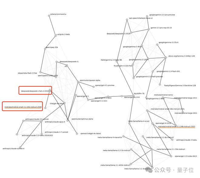 通过比较相似性图中模型的远近位置,就可以发现Mistral-small-3.2和DeepSeek-v3在图中非常接近,这就表明了它们的输出模式高度相似。