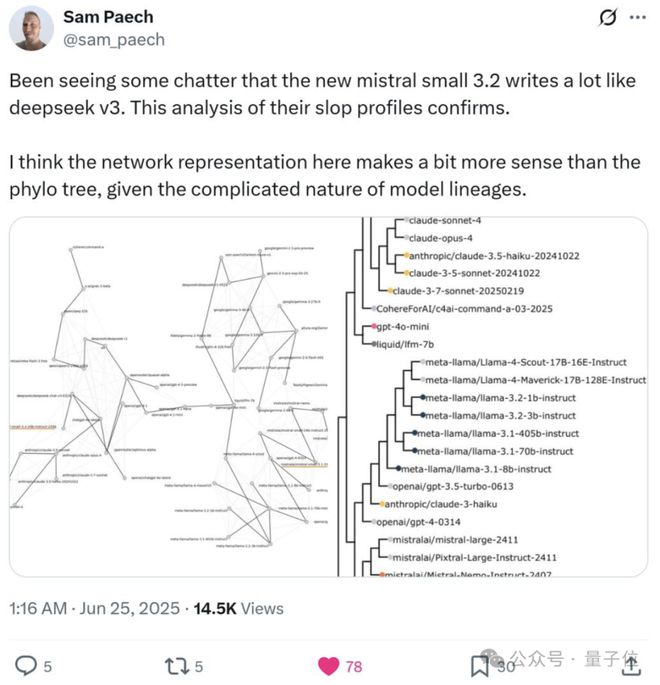 早在今年6月,就有博主通过“语言指纹”分析,发现Mistral-small-3.2和DeepSeek-v3很像。