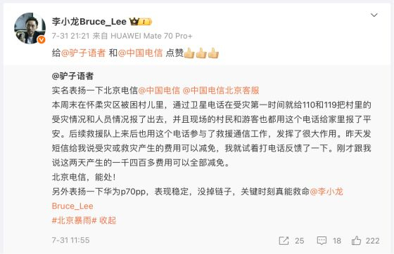 这一新闻也引发了华为终端 BG CTO 李小龙的关注与互动。他在微博特别提醒:“这一段时间暴雨洪灾频发,如果遇到地面通信网络不可用,支持卫星通信的手机就能发挥出重要作用。”不仅如此,李小龙还披露了一组关键数据:7 月 28 日、29 日两天,北京地区使用卫星通信的用户数较平日激增 10 倍以上。