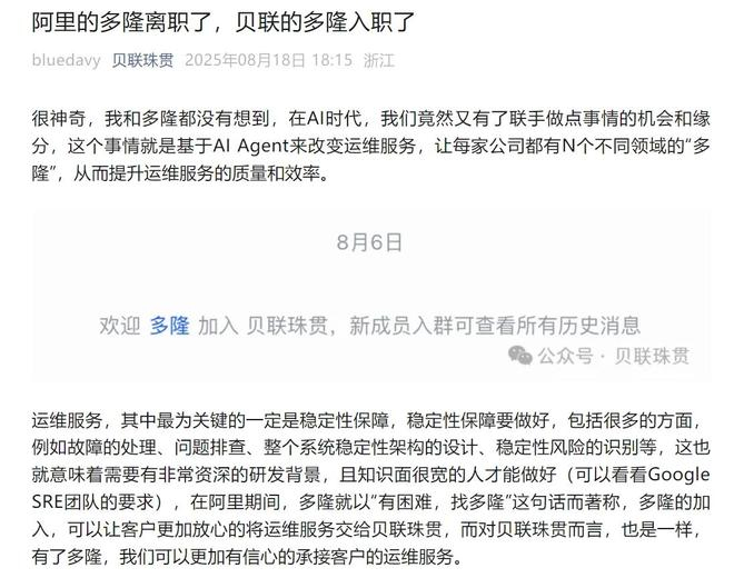 据红星资本局8月19日消息,贝联珠贯科技(浙江)有限公司(下称“贝联珠贯”)在其微信公众号宣布:多隆(指蔡景现)在阿里巴巴(09988.HK)离职后,加入了贝联珠贯。