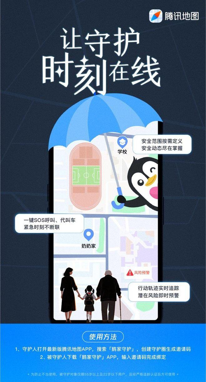 近日,腾讯地图正式推出「鹅家守护」功能,为有老人和孩子的家庭用户提供全方位的安全守护服务,目前已在全国范围上线。