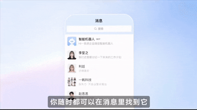 智能机器人聚焦日常问答与流程指令场景,支持将企业内部制度、SOP、知识库导入系统,员工可像与同事聊天一样提问,系统自动生成答案。智能机器人还与OA等系统打通,还可用于触发工单、处理审批等操作。