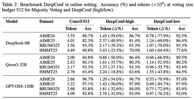 对此,研究人员提出了两种基于最低分组置信度,并会自适应地中止生成过程并调整推理路径的预算的方法:DeepConf-low和DeepConf-high。