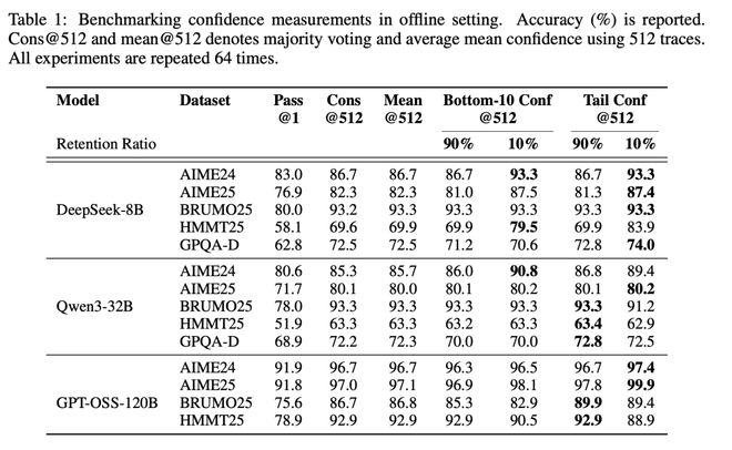 Cons@512和mean@512分别表示使用512条推理轨迹进行的多数投票结果,以及平均置信度的均值。所有实验均重复进行了64次。